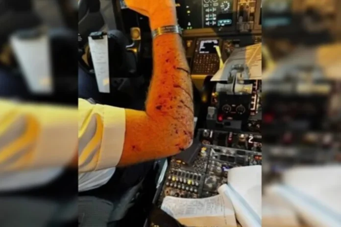 O impacto quebrou o para-brisa multicamadas da aeronave durante a viagem, ferindo o braço de um dos pilotos.