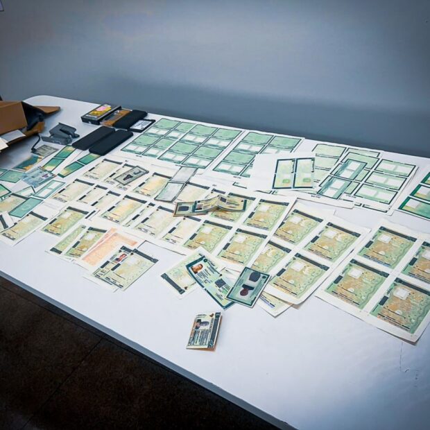 O suspeito, identificado apenas como Carioca, foi detido em sua residência, onde foram encontrados diversos espelhos em branco para Carteiras Nacionais de Habilitação (CNHs), carteiras de identidade, CPFs e equipamentos utilizados para a falsificação. As autoridades também apreenderam um HD contendo matrizes de documentos criados no Corel Draw, além de um caderno com anotações e listas de encomendas, o que auxiliarão na identificação e investigação dos compradores dos documentos falsos.