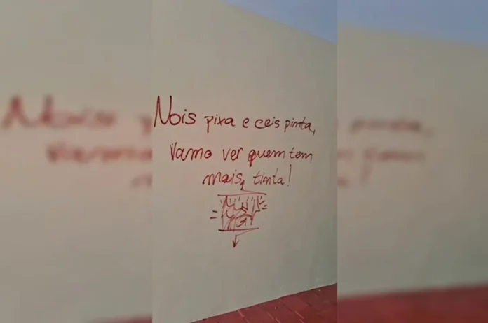 Com tinta fresca e ousadia, os infratores deixaram uma mensagem provocativa às autoridades: “Nóis pixa e vocês pinta, vamo ver quem tem mais tinta (sic)”.
