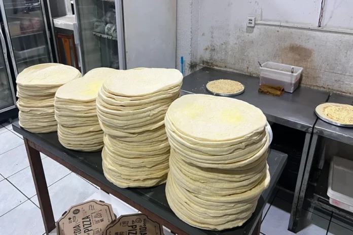 Durante a vistoria, foram encontrados salsicha, milho, bacon, ovos e molhos inadequados para consumo, além das massas de pizza armazenadas sem a devida proteção, aumentando riscos à saúde dos consumidores.