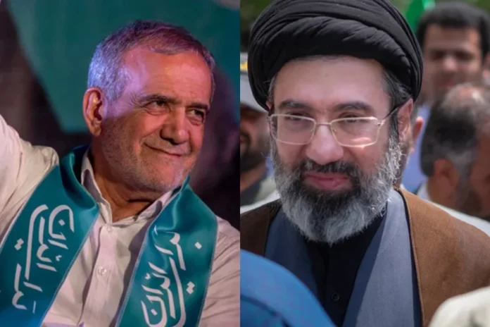 À esquerda, presidente do Irã, Masoud Pezeshkian, e, à direita, Mojtaba Khamenei, novo líder supremo do país – Foto: Morteza Nikoubazl/NurPhoto via Getty Images