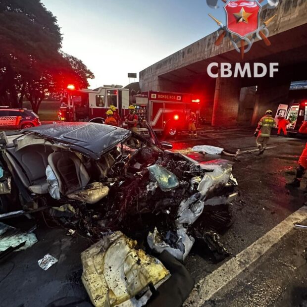 Segundo o Corpo de Bombeiros Militar do Distrito Federal (CBMDF), o acidente aconteceu por volta das 4h30 da manhã e cinco viaturas foram enviadas para o socorro. Ao chegar no local, os bombeiros encontraram o veículo pegando fogo após a colisão.
