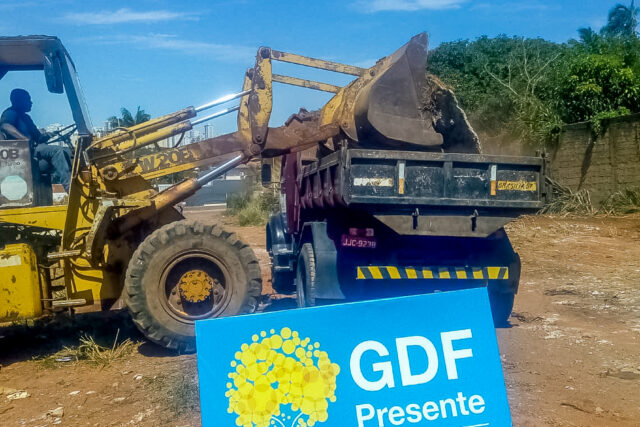 Com ajuda de uma pá mecânica e um caminhão caçamba do GDF Presente, serviços de retirada de entulhos foram realizados também ao longo desta semana na Colônia Agrícola Águas Claras. Em três dias de operação, foram recolhidas mais de 30 toneladas de restos de material de construção misturando com mato e terra.