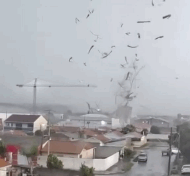 Vídeos nas redes mostram o tornado formando um cone e arrancando partes das casas.