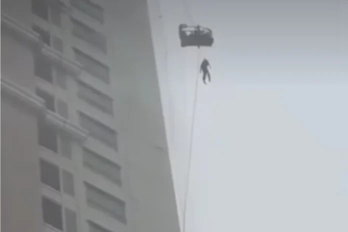 Durante o serviço, ventos e chuvas intensos fizeram o andaime balançar descontroladamente, fazendo com que o homem fosse lançado para fora da estrutura. Embora o cinto de segurança tenha impedido que ele caísse no chão imediatamente, ele foi atingido contra a parede do prédio por cerca de 15 minutos.