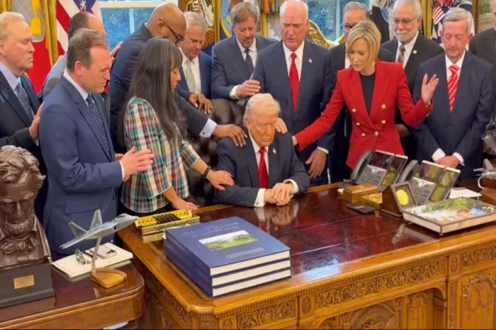 O presidente dos Estados Unidos, Donald Trump, participou de um momento especial na Casa Branca, onde foi cercado por cerca de 20 líderes religiosos durante uma oração no Salão Oval nesta sexta-feira, 6 de março de 2026.