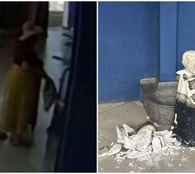 As câmeras de segurança captaram o ato de vandalismo. Nas imagens, vê-se a mulher usando uma bolsa para golpear a estátua, depois derrubando-a com as mãos no chão.