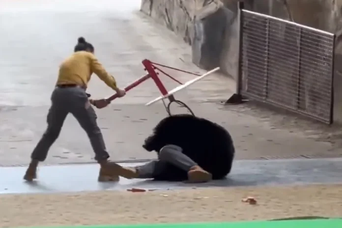 Nas imagens publicadas no Weibo, o urso é visto agarrando o braço do tratador e ficando por cima dele. Outros trabalhadores se aproximam munidos de objetos para tentar afastar o urso.